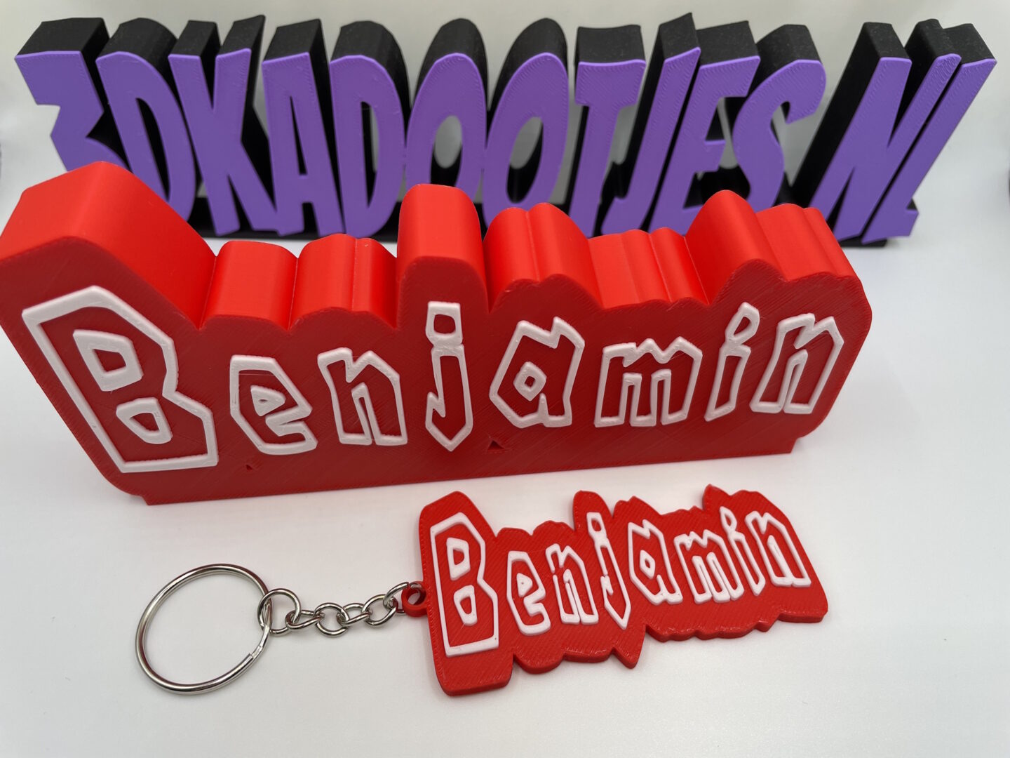 Het naambord staat zelfstandig, dus geen bevestiging nodig. Zet het op een bureau, plank, nachtkastje of in de gamehoek. De bijbehorende sleutelhanger is ideaal voor aan een sleutelbos, rugzak of etui.
